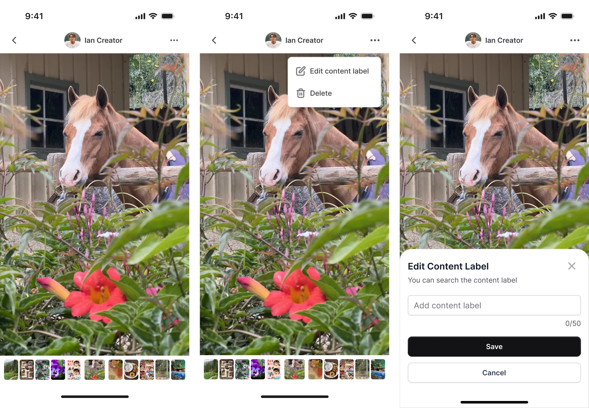 - Tap the three dots in the top right corner to edit content labels or delete items from your Gallery.